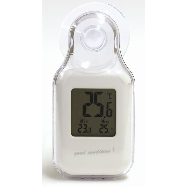 | 商品の特徴 | 商品特徴:防滴タイプの吸盤付きデジタル温度計。吸盤裏表取り替え可能。吸盤を外せば壁掛け穴にもなります。約24時間ごとの最高最低温度同時表示。外気温の測定や水周りにも最適です。 温度計精度:±1℃(0~40℃) 材質:ABS樹脂、生産国:中国 付属品:取扱説明書(保証書付)、CR2025×1(お試し用電池) | ||