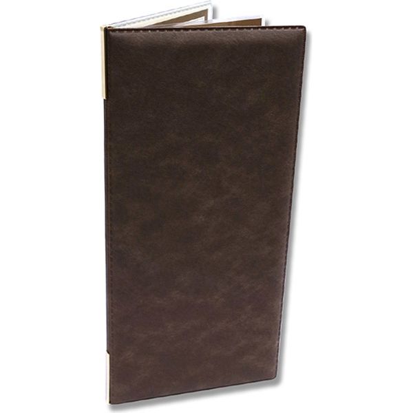 マーブル柄の表紙がオシャレなメニューブック。変形タテサイズ。2+4ページタイプ。表紙カラー;茶