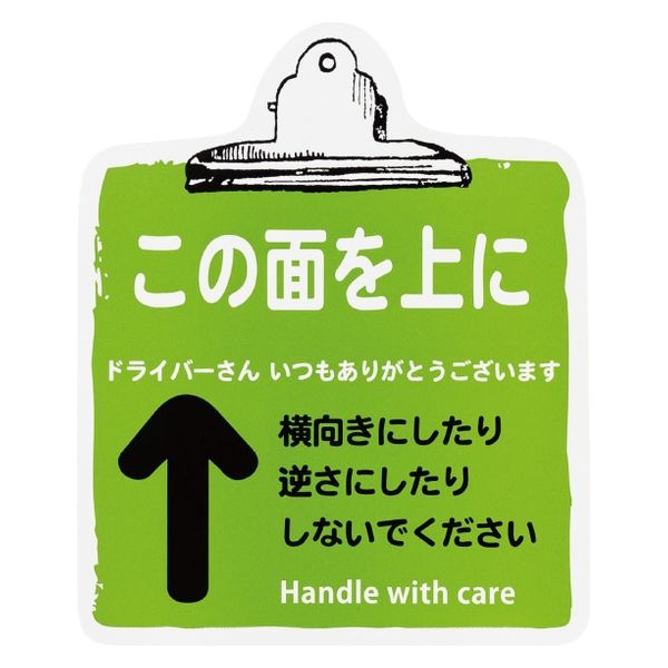 商品の特徴 「この面を上に」の文字とイラストで注意を促すとともに、宅配ドライバーさんへの感謝の気持ちのメッセージを添えたステッカーです。中央部分にミシン目が入っているので、きれいに折って、段ボールの角に貼ることができます。