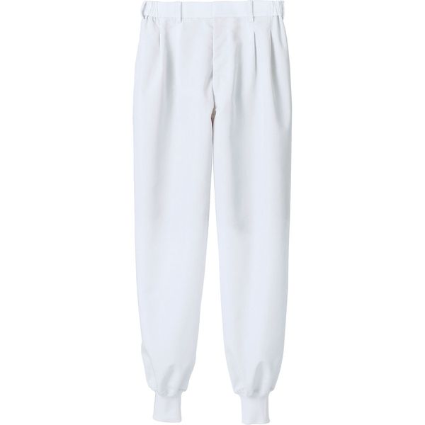 住商モンブランの工場白衣 パンツ、男女兼用、ホワイト、ツータック+両脇ゴム、裏地付、裾口フライス