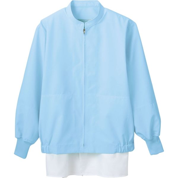 住商モンブランの工場白衣 ジャンパー、男女兼用、長袖、ブルー、腰ネット、吸汗フライス付袖口ネット付、ECO商品