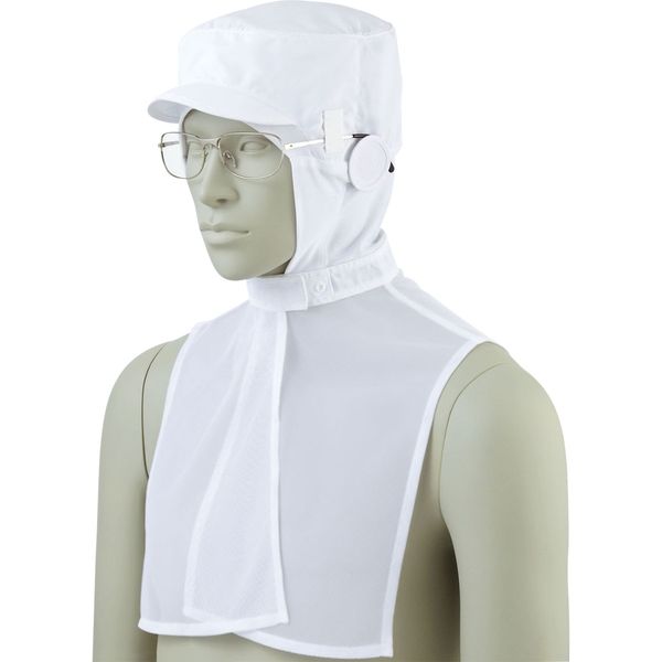住商モンブランの工場白衣 キャップ ケープ付、男女兼用、伸縮ニット式、ホワイト、吸汗ニット、マスク留め付、メガネ留め付、ECO商品