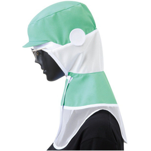 | 商品の特徴 | ツバは耐洗濯性の高い織芯。額はT400(TM)で異物落下防止、汗止め効果があります。首はダブルニットメッシュ、前部留めはスナップボタン。マスクは円掛け式、はさみ込み式メガネ差しを採用。 立体ケープは共布+メッシュ素材。後頭周り調整はゴム入り。 | ||