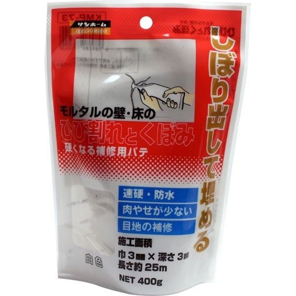 | 【施工方法】 | [1]施工面の補修場所をよく乾燥させ、汚れ、ゴミ、油分等を取り除いてください。[2]内袋を取り出し、袋ごと良くもんで中身を均一にしてください。[3]袋の先端をひび割れ等の施工箇所の幅に合うように切り取ります。[4]ひび割れ等の施工箇所に袋の先端をおしあて袋を押しながら移動させて埋めて下さい。[5]作業後、ヘラなどで材料を押し込み表面をならしてください。※幅が広い、又は深い施工箇所は、1回施工後、時間をおいてもう一、二度施工しヘラ・コテなどで押し込んでならしてください。 | 容量 | 400g |