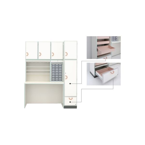 | 商品の特徴 | 多様な収納方法、管理方式に対応。機能性に優れたシステムファニチャー●作業効率性の高い作業台付きキャビネットです。●国際標準規格(ISO3394=600×400mm)のトレーに対応したシステムキャビネット。●感染管理に適したトレービルトイン引出付。 マツヨシカタログ マツヨシコード:23-5211-0103 | ||