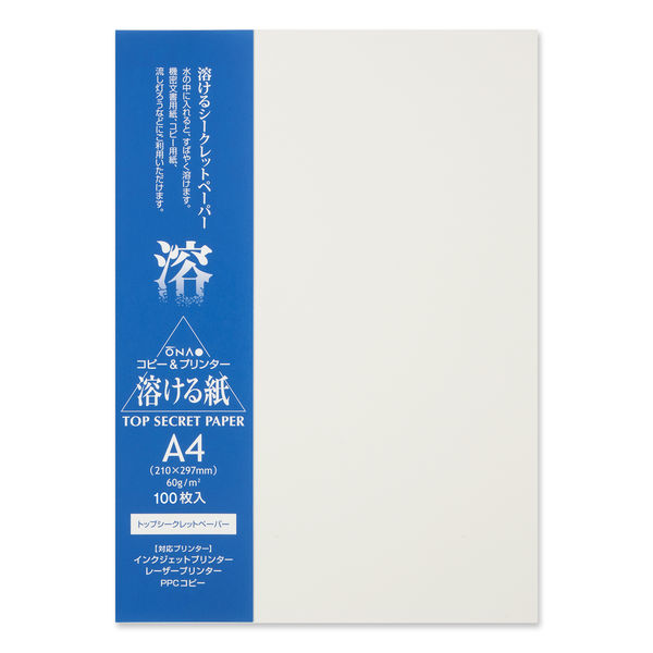 | 商品の特徴 | 水に溶ける紙。ただ水の中に入れるだけですみやかに消えてしまいます。個人情報の保護や社外秘の管理などにご使用いただけます。シュレッダーいらずで環境にも優しい紙です。また、流し灯篭やガーデニングなどにもご使用いただけます。 | ||