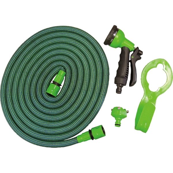 | 商品の特徴 | ●水圧で伸びる秘密は伸縮ホースの多層構造にあり。●内側ホースは伸縮性の高い2層ラテックス構造!厚みもアップ!より頑丈に!●外側カバーは丈夫な化学繊維の折り込みカバー。●8種類の散水パターン。●セット内容:ホース1本、コネクター2個、散水ヘッド、蛇口ニップル、ホースハンガー、使用説明書。 | ||