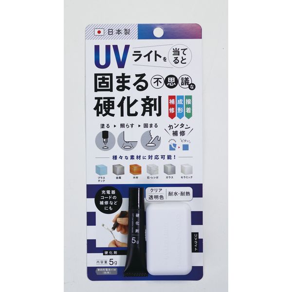 | 商品の特徴 | 硬化剤を塗って付属のUVライトをあてるだけで固まる。瞬間接着剤とは違い、UVライトをあてるまで固まらないので接着位置を決めながら作業が出来る。様々な素材に対応。 | ||