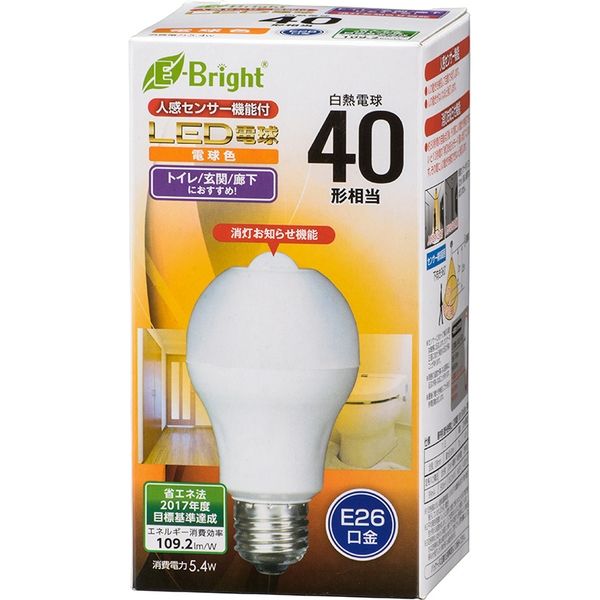 | その他1 | 【 特 長 】● 人感センサー機能付きLED電球● トイレ、玄関、廊下におすすめ● 消灯お知らせ機能付き● 省エネ法2017年度目標基準達成● 白熱電球40形相当の明るさ● 電球色相当● 口金:E26【 仕 様 】■ 寸法:全長…108mm、最大径…60mm■ 質量:76g■ 定格消費電力:5.4W■ 定格入力電流:99mA■ 全光束:590lm■ エネルギー消費効率:109.2lm/W■ 平均演色評価数:Ra83■ 定格寿命:40000h ※屋内用(屋外使用禁止) | ブランド | オーム電機(OHM) |