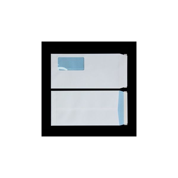 青み掛かった白色の封筒です。請求書や納品書に記載されている住所が見えるように窓が付いた発送に適した封筒です。中身を透け防止に地紋印刷、封緘を簡単にするテープ付です。