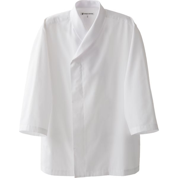 | 商品の特徴 | ライトツイルという新しく開発した生地の7分袖、小さいショールカラーコートです。生地開発意図は商品の耐久性は昔ながらの分厚いコックコートと同等であり、かつしっかりとした作りを保ちながら着用感が軽くて涼しい、という観点です。ポリエステル70%/綿30%という混率ですが綿リッチなところもポイントです。ショールカラーを小さくした衿がデザインポイント、胸元の開きも少なく清潔で品の良い衿になっています。比翼でボタンが見えないというのも品の良さをさらに強調しています。制電糸入り。透け防止、UVカット機能あり。男女兼用。 | ||