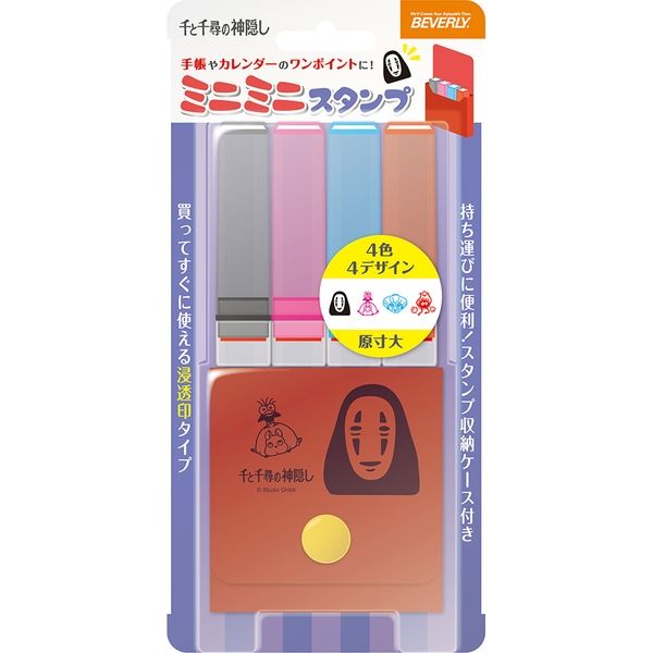 | 商品の特徴 | 【ちっちゃくて可愛い浸透印。ケース付きだから持ち運びも便利】手帳や卓上カレンダーなどに便利なミニサイズのスタンプ4本セット。インクパッド不要の浸透印が持ち運びに便利なケース入り。ケースは「千と千尋の神隠し」の可愛いイラスト入り。目印として押してもわかりやすい4色4柄。捺印サイズは6mm角以内なのでちょっとしたワンポイントに便利です。インク色:ブラック、ピンク、ブルー、レッドの4色 | ||