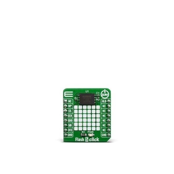 - ●MikroElektronika Flash 5 Click は、 Winbond の W25N01GVZEIG/IT ( 1G ビット)シリアル SLC NAND フラッシュメモリを搭載しており、スペース、ピン、電力の限られたシステム向けのストレージソリューションになります。これは mikroSDK 準拠のライブラリでサポートされており、ソフトウェア開発を簡素化する関数が含まれています。一般的な SPI インターフェイスを搭載しています 従来の大容量 NAND 型不揮発性メモリスペース RAM へのコードシャドウイングに最適です