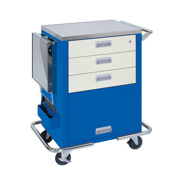 | カラー | ブルー | 仕様 | ●サイズ/幅57×奥行43×高さ92cm、引出し内寸:幅44.8×奥行33.6×高さ9.4cm(3個)、下段スペース:幅44.5×奥行34.5×高さ30cm、補助台:35×35cm●重さ/約48kg●材質/本体:スチール、天板:ステンレス●キャスター/φ10cm(静音・対角ストッパー付)●付属品/心肺蘇生用背板、電源コンセント(5連/100V)、仕切板(縦3枚、横3枚) |