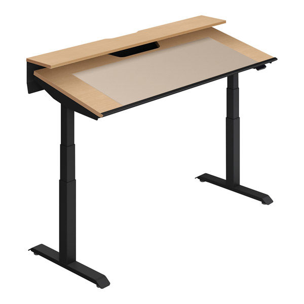 すべての姿勢を叶える1台を。電動昇降機能に加え、デスク天板の傾斜角度を調整できワーカーのモードチェンジを可能にするシークエンスチルト。