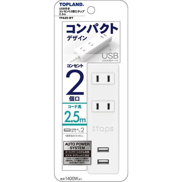 本商品:トップランド USB付き電源タップ2.5m コンセント2口 USB2口 TPA25-WT 1個(直送品)