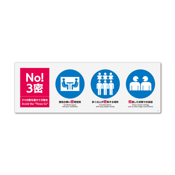 | 商品の特徴 | ウイルス対策に!3つの密をオリジナルピクトグラムで説明した案内標識サインステッカー。 | ||