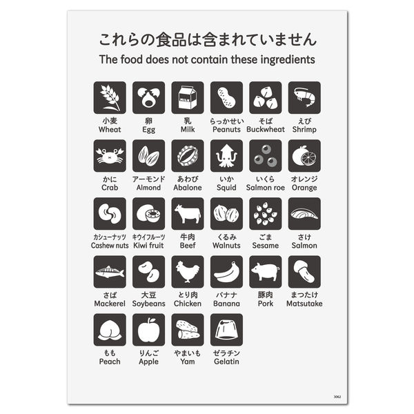 | 商品の特徴 | 食物アレルギーの原因となる特定原材料など28種の食材を含まないことを表示できる案内標識サインステッカー。 | ||