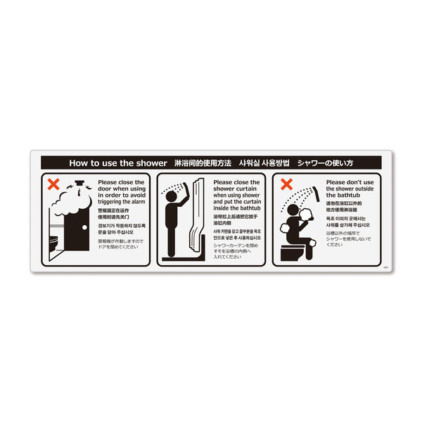 | 商品の特徴 | インバウンド対応に!外国人観光客向けにホテルのシャワーの使い方やマナーを説明する案内標識サイン看板。 | ||