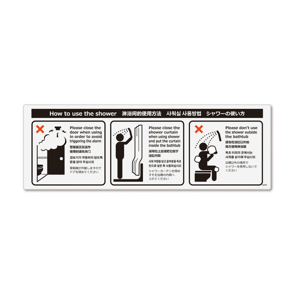 | 商品の特徴 | インバウンド対応に!外国人観光客向けにホテルのシャワーの使い方やマナーを説明する案内標識サイン看板。 | ||