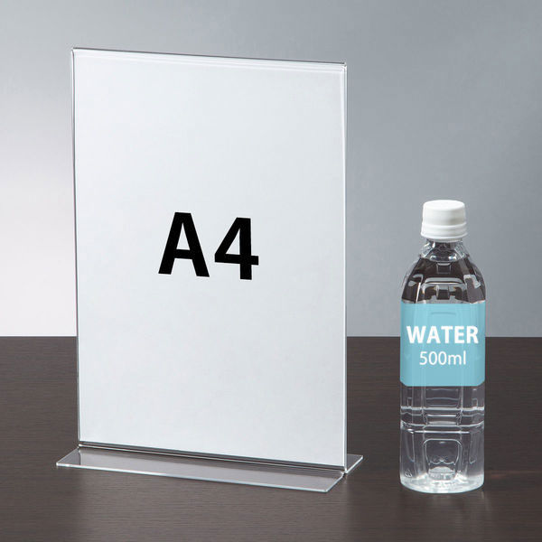 透明度が高いアクリル製両面サインホルダー。A4サイズのタテ型タイプ。置いた時に安定感のある、T型形状。店舗、飲食店のPOPや、オフィスの案内板を引き立たせます。
