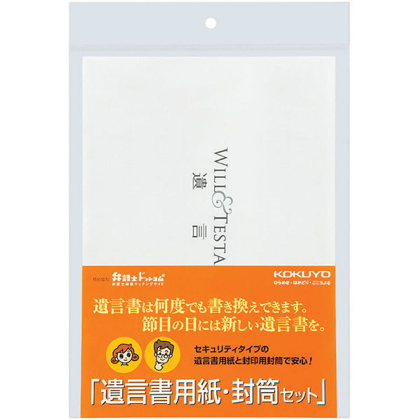 | 商品の特徴 | ●遺言書キットご購入者のご要望の声を受けて生まれた用紙と封筒のセット。定期的な遺言書の書き換えや、書き損じ時の予備としてもご使用いただけます。●遺言書用紙には、コピーするとコピー側に「複写」「COPY」の文字が浮かび上がる、コピー予防タイプの厚手用紙を採用しています。●封印用封筒は、一度開封すると元に戻せないセキュリティタイプ。日付と名前を記入し押印するだけで、簡単に遺言書を封印できます。●遺言書用紙と同じレイアウトの下書き用紙がセットになっていて、文字の配置まで考えて下書きできます。 | ||