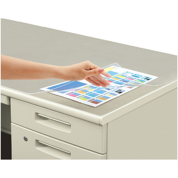 | 商品の特徴 | ●環境に配慮し、非塩ビ素材(オレフィン系樹脂)を採用した透明タイプのデスクマット。再生オレフィンタイプに比べ廉価で、塩ビタイプと同等の価格なので、より環境負荷の少ないタイプとして塩ビタイプからの買い替えに最適です。●透明なのでマットに挟んだ書類が見やすい素材です。●コピーのインキなども付着しにくい両面非転写タイプです。●グレー色の下敷きが付属しています。●対応するJIS規格の天板寸法:1600×700mm●マット外寸法:1587×687mm | ||