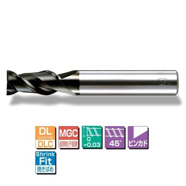 | 商品の特徴 | ●DLCコーティングにより、耐摩耗性・面平滑性に優れ、溶着も防ぎます●アルミ加工に最適●DL(DLC)コーティング●超微粒子超硬 | ||