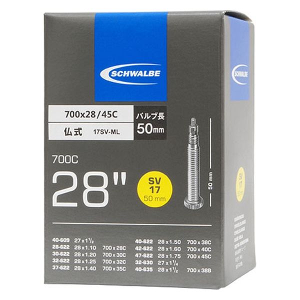 - 27×1-1/2、700×28C(28×1.10)、700×30C(28×1.20)、700×32C(28×1.25)、700×35C(28×1.40)、700×38C(28×1.50)、700×40C(28×1.60)、700×45C(28×1.75)、27×1-1/4、700×38B(28×1-1/2) (ETRTO:40-609、28-622、30-622、32-622、37-622、40-622、42-622、47-622、32-630、40-635) 仏式バルブ50mm