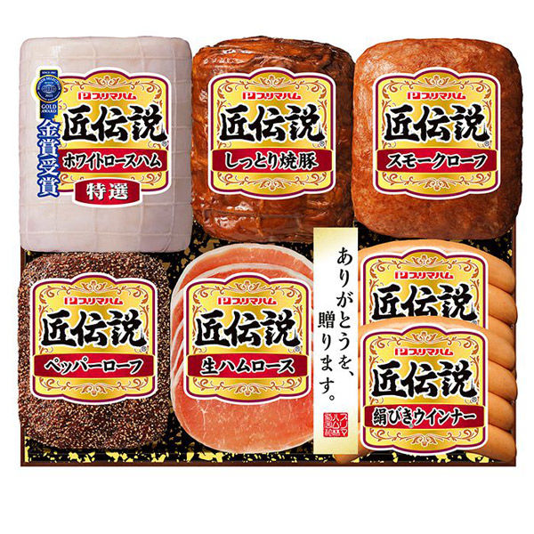 | 内容量 | 絹びきウインナー80g×2、特選ホワイトロースハム250g・しっとり焼豚160g・スモークローフ140g・ペッパーローフ140g・生ハムロース32g×各1 | 受付終了 | 45499 |