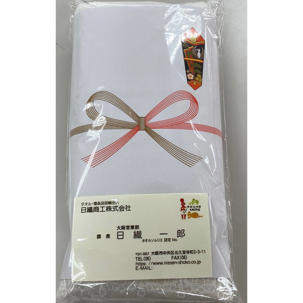 ワンランク上のお配りものを。無地熨斗が今治タオルに付いています(フェイスタオルサイズ)。名刺を入れられるポケット付きの袋に入っています。