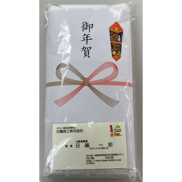 ワンランク上のお配りものを。御年賀の熨斗が今治タオルに付いています(フェイスタオルサイズ)。名刺を入れられるポケット付きの袋に入っています。