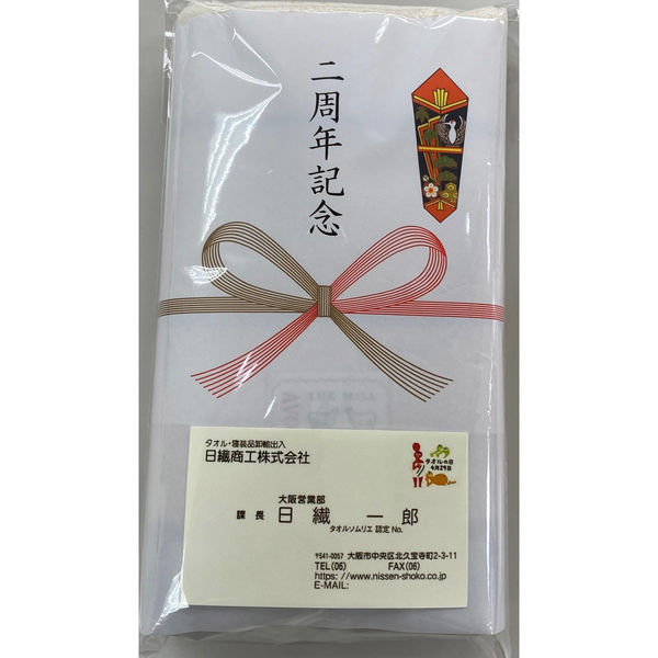 ワンランク上のお配りものを。二周年記念の熨斗がタオルに付いています(フェイスタオルサイズ)。名刺を入れられるポケット付きの袋に入っています。