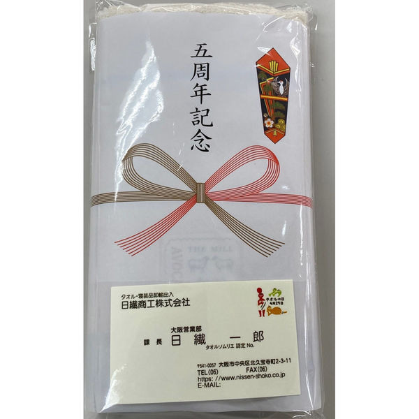 ワンランク上のお配りものを。五周年記念の熨斗がタオルに付いています(フェイスタオルサイズ)。名刺を入れられるポケット付きの袋に入っています。