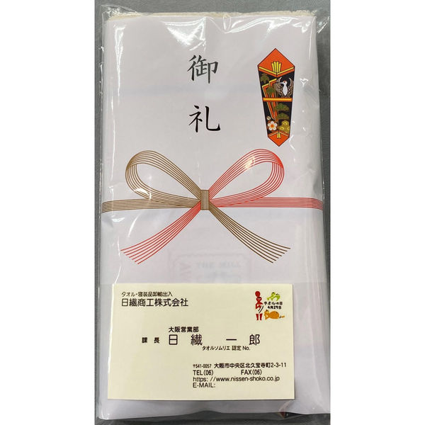 ワンランク上のお配りものを。御礼の熨斗がタオルに付いています(フェイスタオルサイズ)。名刺を入れられるポケット付きの袋に入っています。