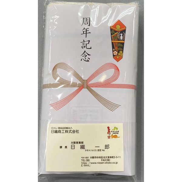 ワンランク上のお配りものを。周年記念の熨斗がタオルに付いています(フェイスタオルサイズ)。名刺を入れられるポケット付きの袋に入っています。