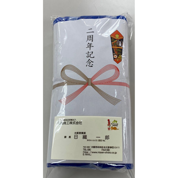 ワンランク上のお配りものを。二周年記念の熨斗がタオルに付いています(フェイスタオルサイズ)。名刺を入れられるポケット付きの袋に入っています。