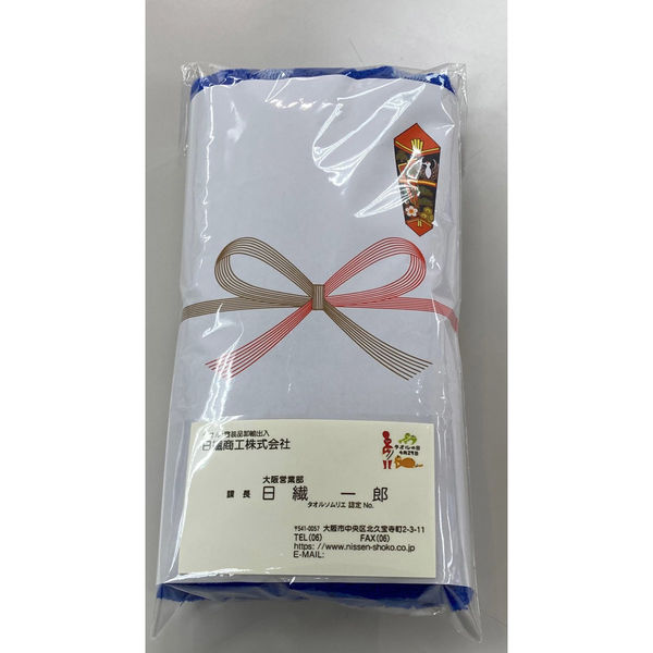 ワンランク上のお配りものを。無地熨斗がタオルに付いています(フェイスタオルサイズ)。名刺を入れられるポケット付きの袋に入っています。