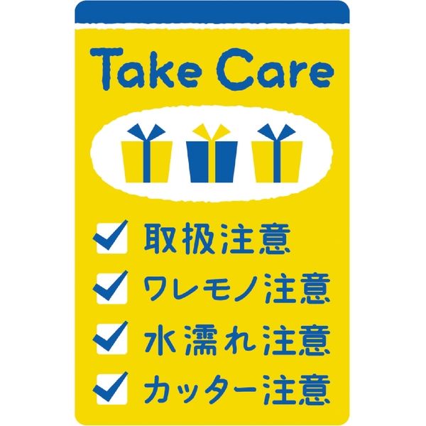 「取扱注意」「ワレモノ注意」「水漏れ注意」「カッター注意」が記載されたシールです。荷物の仕上げなどにお使いいただけます。