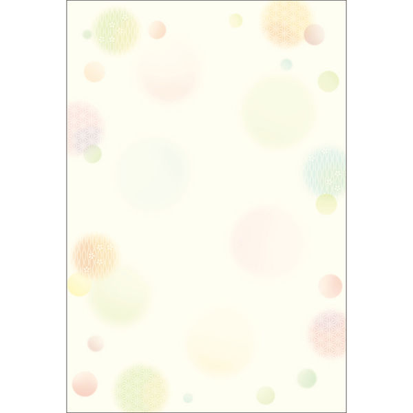 | 商品の特徴 | カラフルな水玉柄をデザインした、はがきサイズの用紙です。洋型2号の封筒にぴったり入るサイズです。※インクジェット・レーザー対応。 ※手描き用にもご使用頂けます。 ※コピー機では、トナーが定着しにくい機種があります。機械メーカー様にお問い合わせ下さい。※郵便番号枠は入っていません。 | ||