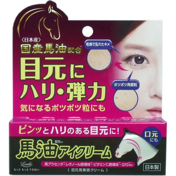 - 目元にハリ・弾力!もっともっとうるおい♪高品質な日本馬油を使用。肌なじみに優れて角質層の深くまで浸透して、気になる目元をふっくらと仕上げます。●気になるポツポツ粒にも。●無香料・無合成着色・合成ポリマー不使用。●馬プラセンタ・レチノール誘導体・ビタミンC誘導体・コエンザイムQ10・ハトムギエキス・エラスチン・ヒアルロン酸・コラーゲン・大豆油配合。馬油は人の皮膚にとても近い成分を持っているため、お肌への浸透力が高く保湿力に優れています。また、自然な油脂であることから副作用の心配が少なく、安心してお使いいただけます。