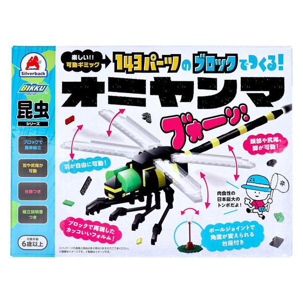 | 商品の特徴 | ●ブロックでつくる、昆虫シリーズ! ●羽が自由に可動!頭部や尻尾、脚が可動! ●肉食性の日本最大のトンボを、ブロックでリアルに再現! ●ボールジョイントで角度が変えられる台座つき! ●いろんなところが動いて、つくってからも楽しめる! ●組立説明書がわかりやすいので、はじめてでも迷わずに作れます。 ●オニヤンマ:日本最大のトンボとして知られ、日本列島に広く分布する。肉食性で大あごの力が強いので要注意!名前の由来は鬼のような怖そうな顔と体の黒と黄色の模様が鬼のつけるふんどしを思わせるからだと言われている。 | ||