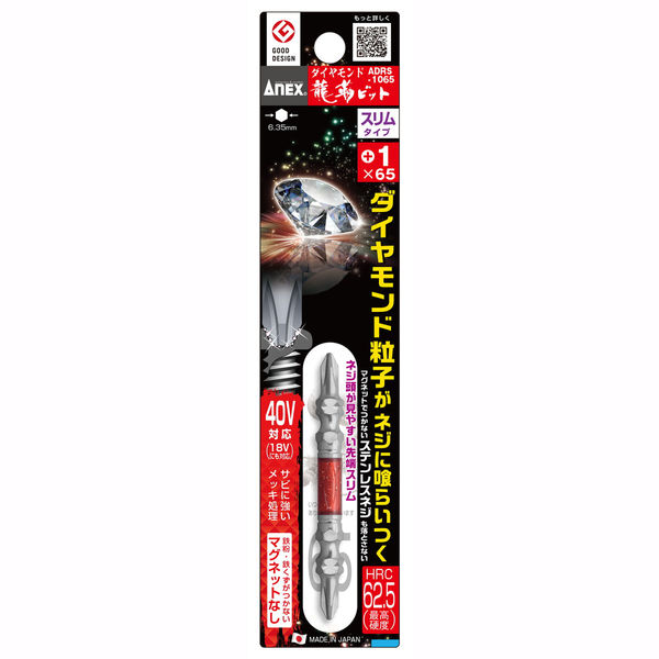 | 商品の特徴 | ダイヤモンド粒子/ビット表面はサビに強い無電解ニッケルメッキ+ダイヤモンドコーティング。マグネットの付かないネジ(ステンレス・真鍮・アルミ・樹脂など)に喰らいつく。トーション部/曲がりに強く、伝達力が高いトーション設計。高トルクインパクトドライバーに最適な衝撃吸収ビット。高靭性・高硬度/新硬強度鋼と独自の熱処理により高靭性と高硬度を実現。折れに強く、摩耗に強い。日本製。 | ||