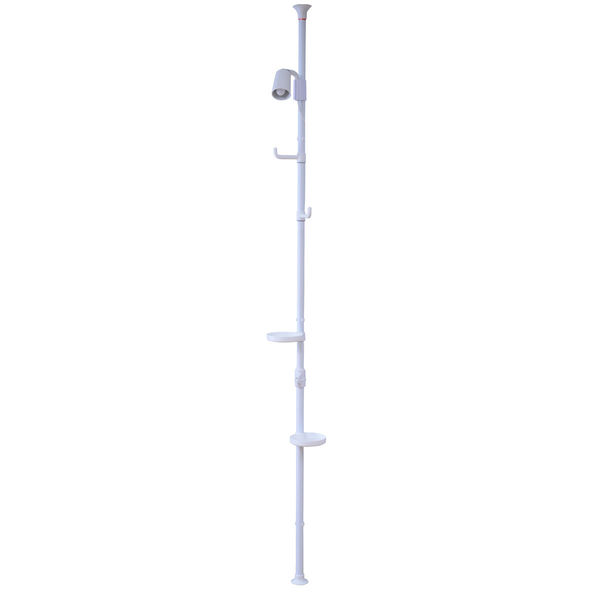 突っ張り式のスポットライト。簡単設置&ライトの高さ・向きは調整可能。天井、床の接地部は滑り止め付き。フック2本とトレー2枚付きで、収納・ディスプレイとしても有効活用。