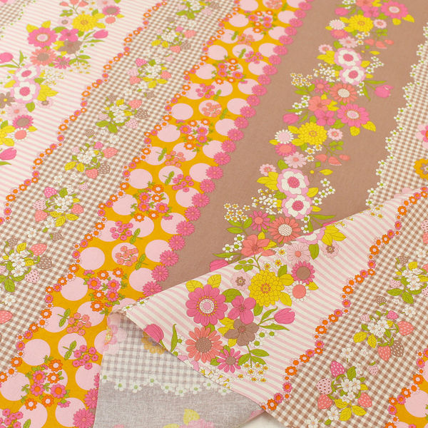 70’s フラワーボーダー プリント生地 ピンク×ブラウン 巾約108cm×6mカット CHU052-2B-6M(直送品)