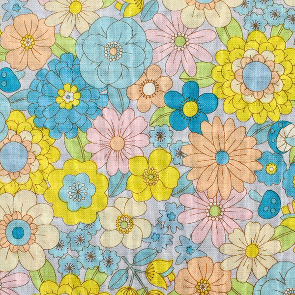 70’s フラワーガーデン プリント生地 ブルー系 巾約108cm×2mカット CHU052-3C-2M 1セット(巾約108cm×2(直送品)