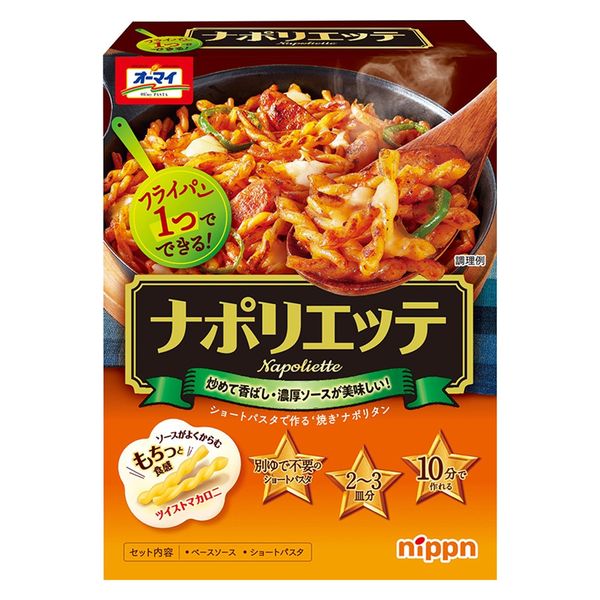 | 商品の特徴 | 今夜はみんなで新メニュー、ナポリエッテにしよう。炒めて香ばし・濃厚トマトソースが美味しい’焼’ナポリタンが、フライパン1つで10分で完成します。くるくる形状にソースがよく絡むツイストマカロニを新採用しました。 | ||
