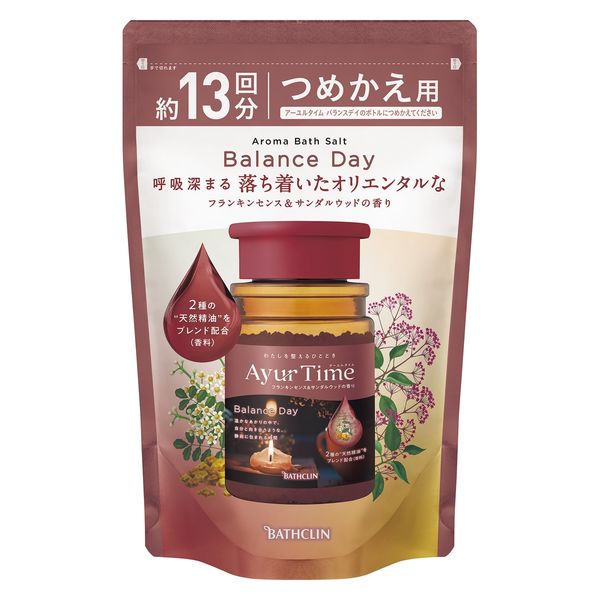 | 内容量 | 520g | 使用方法 | 【ボトルへのつめかえ方】●つめかえ時には以下の事項をお守りください。・必ず「アーユルタイム バランスデイ」のボトルにつめかえてください。・本体の商品を、すべて使い切ってからつめかえてください。・他の製品や水と混ぜないでください。1.切り口から開封してください。手でも切れます。2.本体容器に全量を注ぎ入れてください。【つめかえた後の使用法】お風呂の湯 (200L)に約40gの割合で本品を溶かしてから入浴します。計量には本体容器のキャップ(キャップの内枠の一番上の線が約40g)をご使用ください。 |