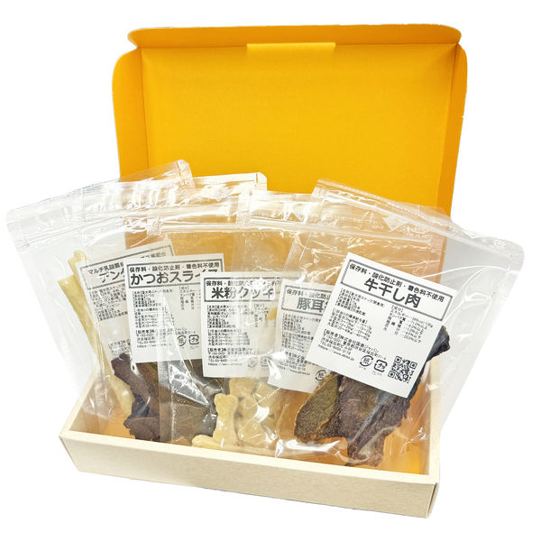 | 注意事項 | ※品質保持のため脱酸素剤を封入しておりますが、これは食べられません。※手に持って与える場合は、かまれないようにご注意ください。※子供が誤食しないように、子供の手の届かない所に保管してください。※子供がペットに与える時は、安全のため大人が監視してください。 | 内容量 | ●かつおスライス、豚耳細切り、米粉クッキー、牛干し肉:約15g ●デンタルガム:3本 |