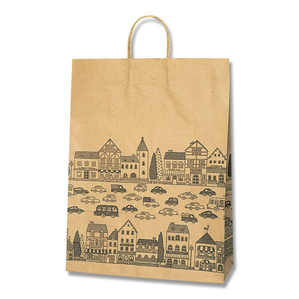 商品の特徴 クラフト地に町並みのイラストをデザインした手提げ紙袋です。縦長のスタンダードサイズ。●手紐:丸紐未晒●入数:50枚
